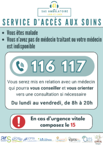 Vous n’avez pas de médecin ou votre médecin est indisponible temporairement alors que votre état de santé nécessite une consultation ? Contactez le 116 117, vous serez mis en relation avec un médecin qui pourra vous conseiller et vous orienter. En cas d’urgence vitale, contactez le 15.