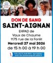 Mercredi 27 mai 2026 Don du sang Saint-Aignan Rendez-vous à l’EHPAD de Saint-Aignan pour une collecte de sang. L’Etablissement Français du Sang compte sur vous ! Pour plus d'informations