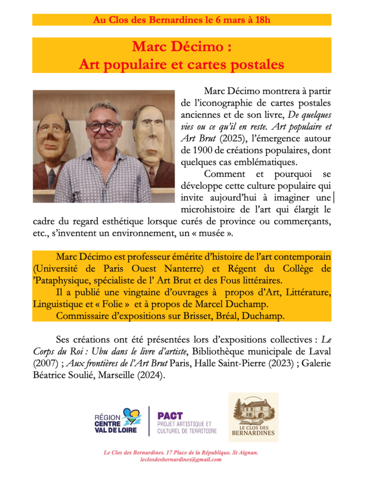 Marc Décimo montrera à partir de l’iconographie des cartes postales anciennes et de son livre, De quelques vies ou ce qu’il en reste. Art populaire et Art Brut, l’émergence autour de 1900 de créations populaires, dont quelques cas emblématiques. Comment et pourquoi se développe cette culture populaire qui invite aujourd’hui à imaginer une microhistoire de l’art qui élargie le cadre du regard esthétique lorsque commerçants s’inventent un environnement, un « musée ».