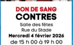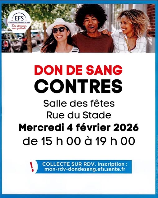 L’Etablissement Français du Sang vous invite à donner votre sang à la salle des fêtes de Contres, commune du Controis-en-Sologne, de 15 h 00 à 19 h 00 le mercredi 4 février 2026.
