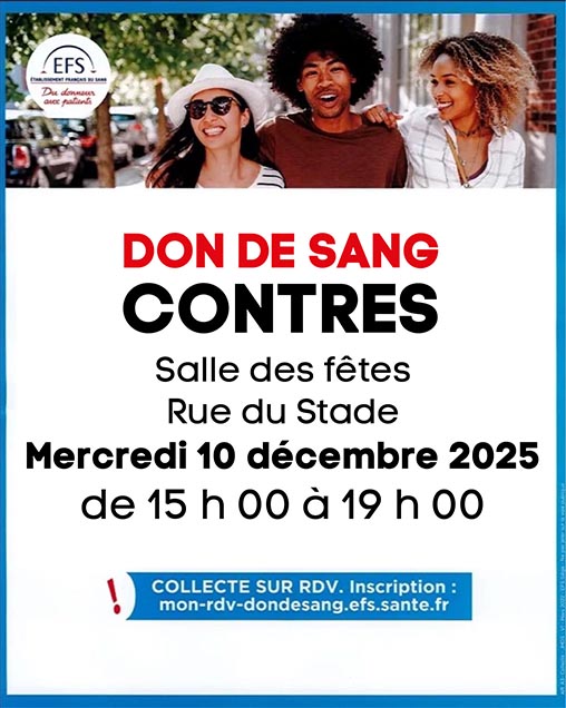 L’Etablissement Français du Sang vous invite à donner votre sang à la salle des fêtes de Contres, commune du Controis-en-Sologne, de 15 h 00 à 19 h 00 le mercredi 10 décembre 2025.