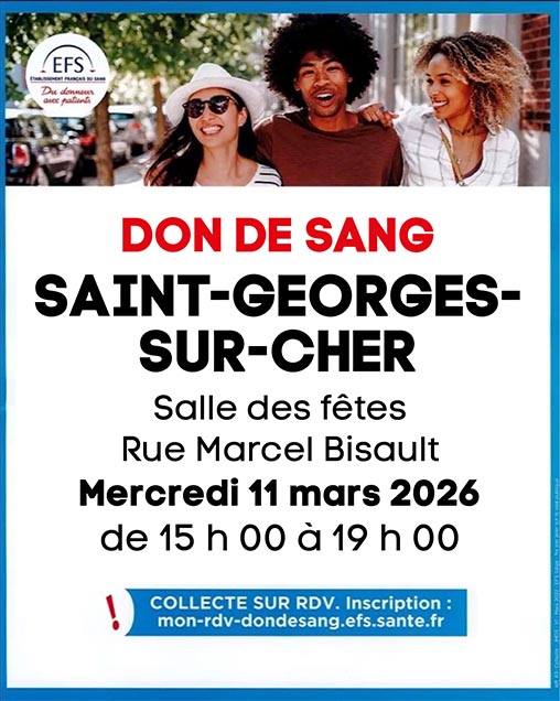 L’Etablissement Français du Sang vous invite à donner votre sang à la salle des fêtes de Saint-Georges-sur-Cher de 15 h 00 à 19 h 00 le mercredi 11 mars 2026.