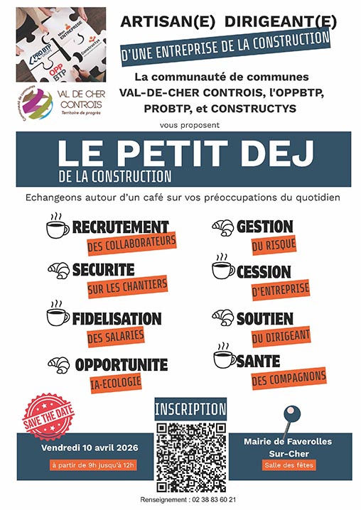 Artisan(e) dirigeant(e) d’une entreprise de la construction, la Communauté de communes Val de Cher Controis, l’OPPBTP, PROBTP et CONSTRUCTYS vous proposent un petit déjeuner de la construction ! Venez échanger autour d’un café sur vos préoccupations du quotidien (recrutement, gestion, sécurité, cession, fidélisation, soutien, opportunité, santé).