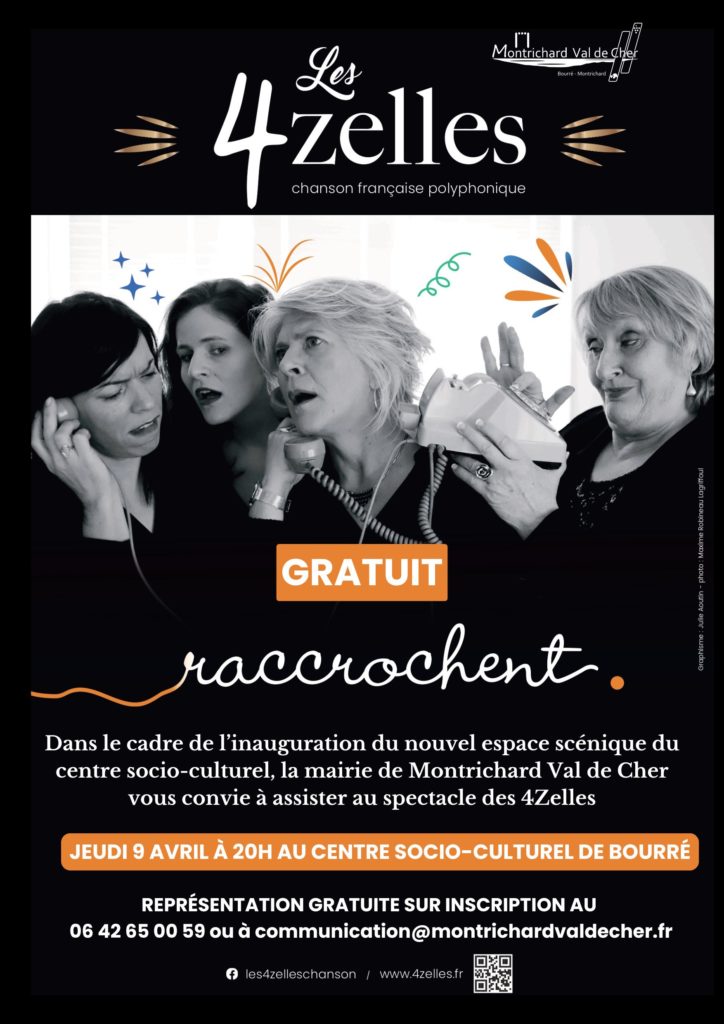Le Centre socio-culturel de Bourré accueillera le groupe Les 4’Zelles, formation de chanson française polyphonique, le jeudi 9 avril 2026 à 20h. Avec leur spectacle Raccrochent, ces quatre artistes revisitent la chanson française avec humour, sensibilité et énergie, dans une mise en scène originale et pleine de complicité.