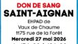 Don du sang Saint-Aignan 10 mars 2026 Rendez-vous à l’EHPAD de Saint-Aignan pour une collecte de sang. L’Etablissement Français du Sang compte sur vous !